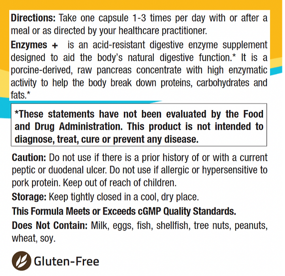 Other Ingredients: Hydroxypropyl methylcellulose (vegetable capsule), microcrystalline cellulose, bamboo silica, l-leucine. Does Not Contain: Milk, eggs, fish, shellfish, tree nuts, peanuts, wheat, soy. Caution: Do not use if there is a prior history of or with a current peptic or duodenal ulcer. Do not use if allergic or hypersensitive to pork protein. Keep out of reach of children. Storage: Keep tightly closed in a cool, dry place.