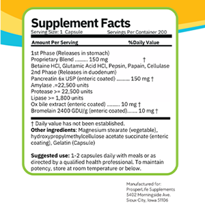Elevate your digestive health with Enzymes Plus from ProsperLife Supplements! This acid-resistant digestive enzyme supplement is designed to aid the body's natural digestive function. It is a porcine-derived, raw pancreas concentrate with high enzymatic activity to help the body break down proteins, carbohydrates, and fats efficiently. At ProsperLife, we are dedicated to empowering your health and wellness journey with high-quality, scientifically-formulated supplements. Discover the transformation that optimal digestion can bring to your life! These statements have not been evaluated by the Food and Drug Administration. This supplement is not intended to diagnose, treat, cure, or prevent any disease.