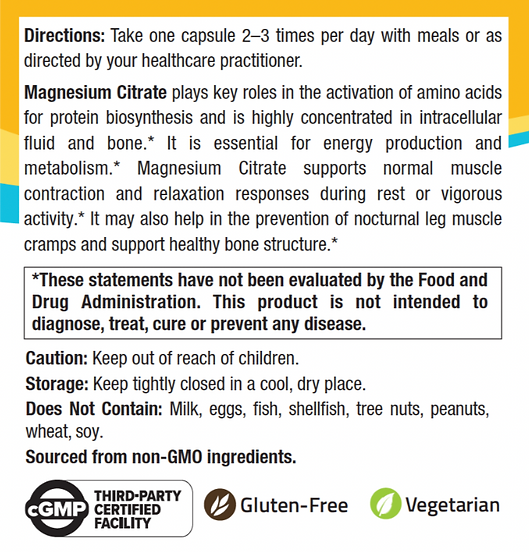 Magnesium Citrate is a well-known form of magnesium that’s easily absorbed by the body and plays a supportive role in many natural processes. This essential mineral is involved in hundreds of biochemical reactions and is often included in daily routines to help maintain muscle function, promote a sense of calm, and support overall wellness. Our formula is crafted to fit into your lifestyle and wellness goals, making it easy to stay consistent with your magnesium intake. Whether you're focused on maintaining energy levels, staying relaxed, or simply supporting your body's natural balance, Magnesium Citrate is a smart and simple addition to your daily supplement routine.
