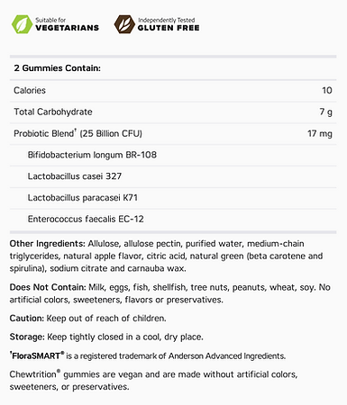 These high-quality gummies are a convenient and delicious way for children and adults to get the nutrition they need. All our Chewtrition® Gummies are sugar-free, gluten-free, and vegan. They are made with allulose derived from figs and don’t contain any artificial colors or sweeteners. Enjoy delicious gummies while supporting your gut health with NuBiotic®.* Our gummies feature FloraSMART® tyndallized probiotics (postbiotics), which feature multiple strains produced in Japan from plant-origin lactic acid bacteria that have been heavily researched. This research indicates compelling benefits for skin health, digestive regularity, and immunity.* These natural apple-flavored gummies provide a convenient and delicious way to incorporate probiotics into your daily wellness regimen.